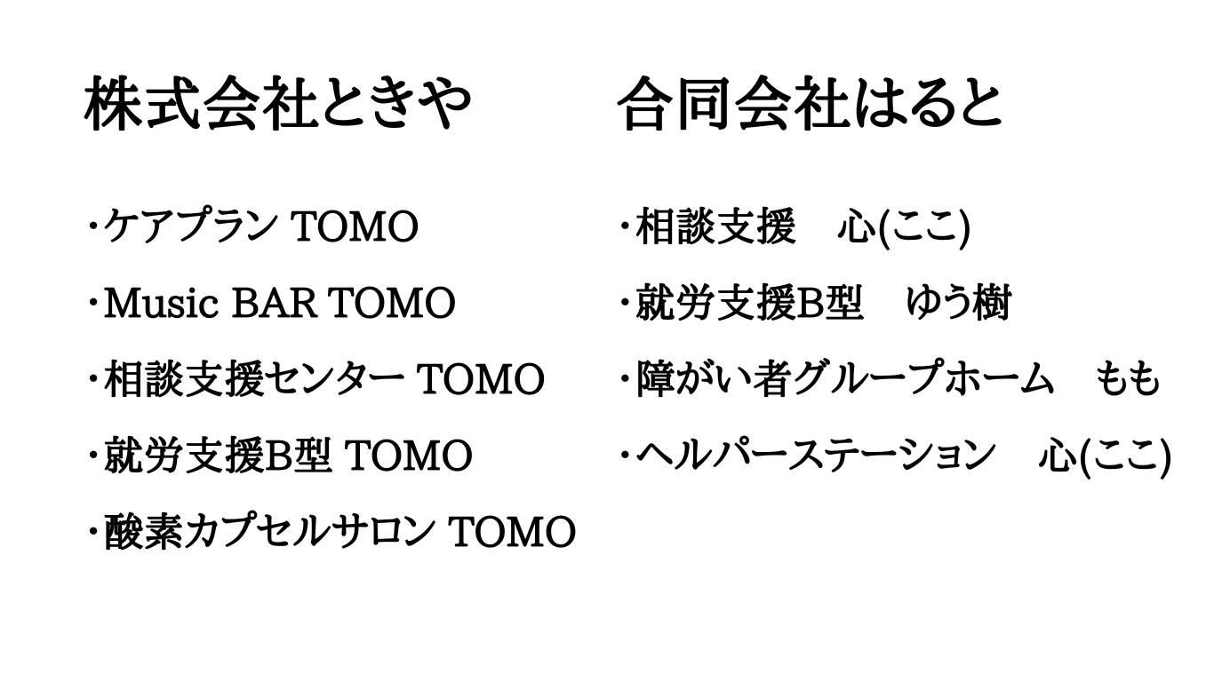 株式会社ときやは、大阪府泉大津市東雲町4-14に拠点を構え、就労継続支援B型や障がい者支援、オリジナルプリントTシャツ制作販売など多角的な事業を展開しています。